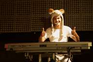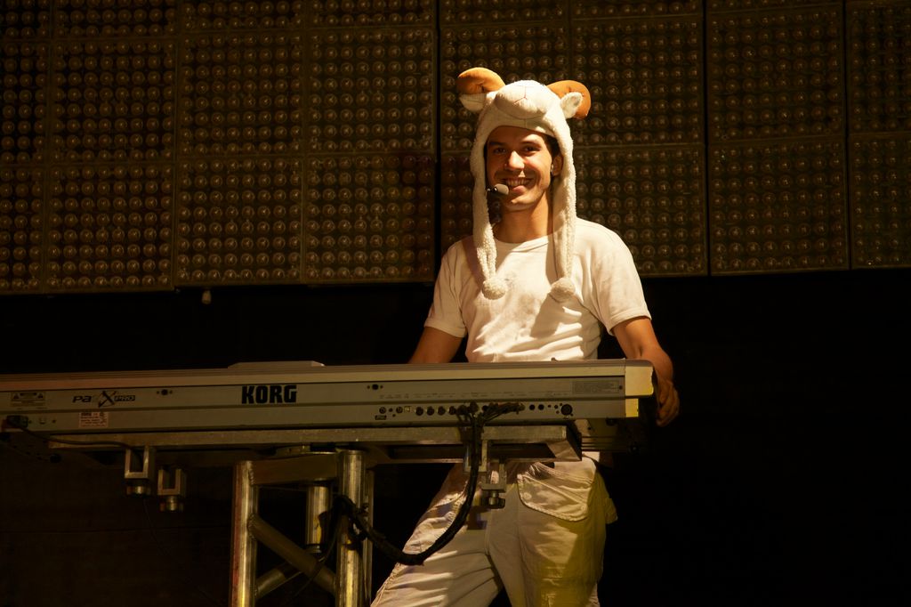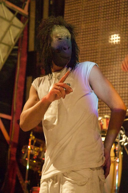 - Primeiro, uma das dançarinas pegou num macaco de pelúcia, que fez interagir com os músicos, com brincadeiras e tropelias.
