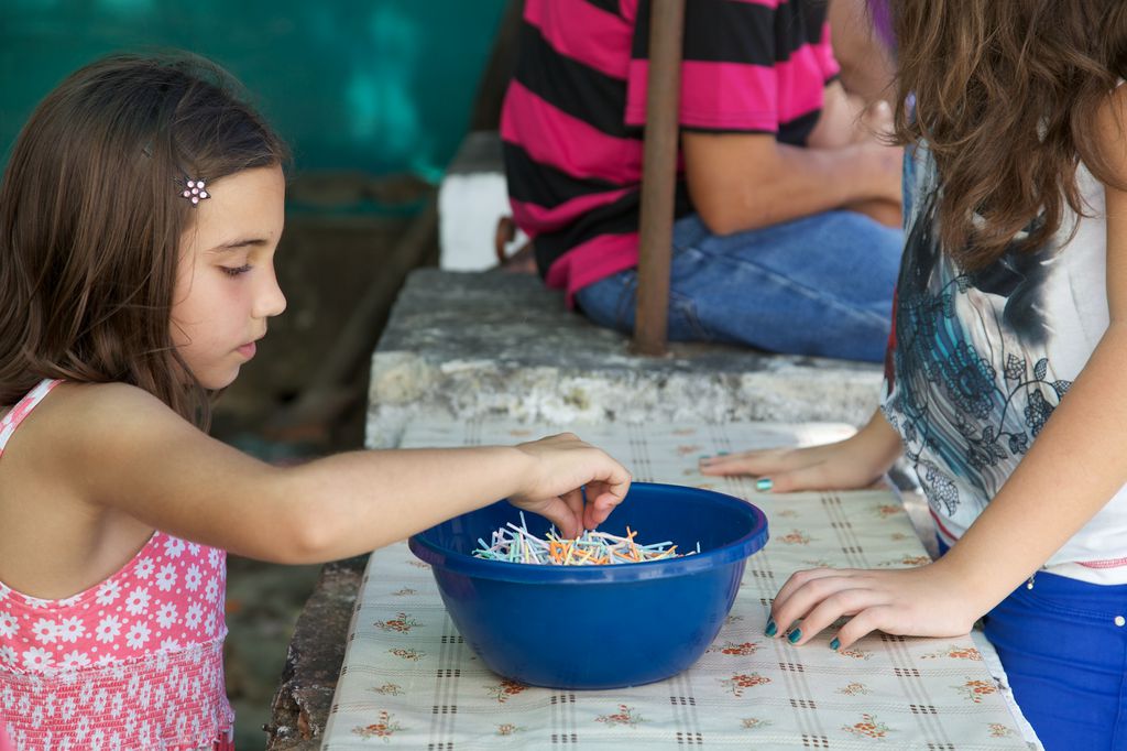 Na quermesse, mulheres e crianças vendem rifas. Ao lado da igreja, vendem-se também fatias de bolos caseiros.