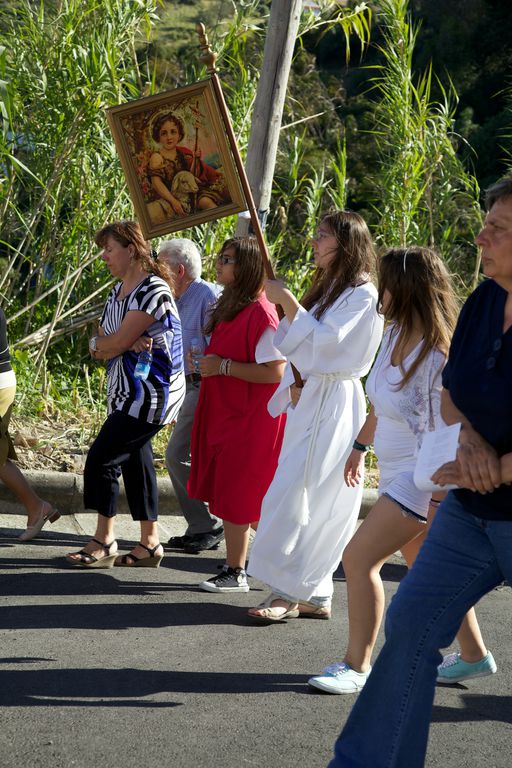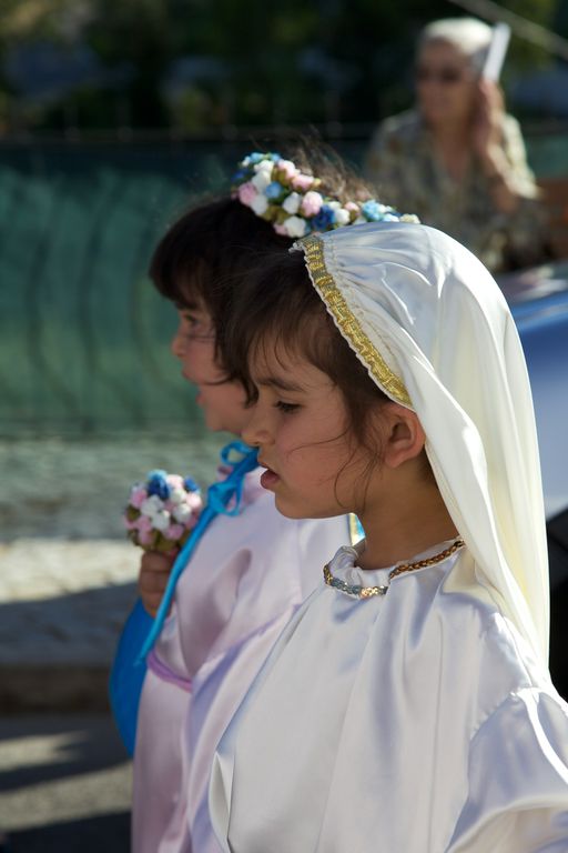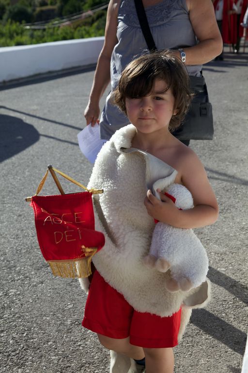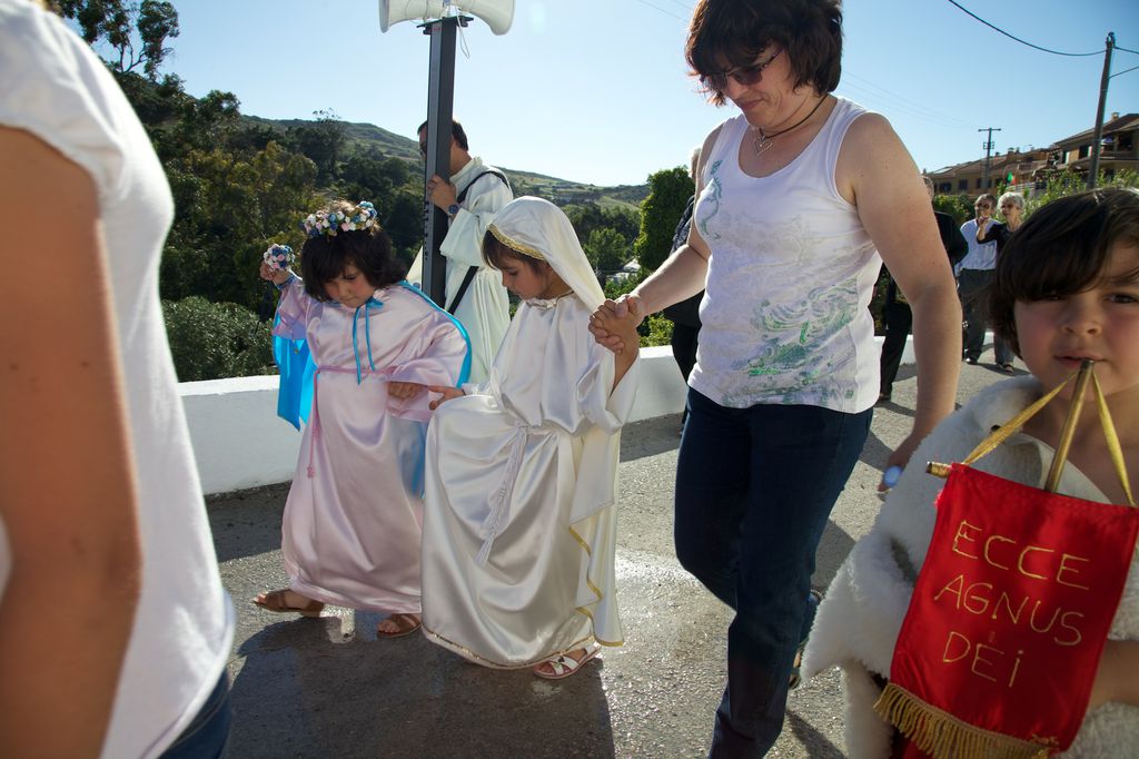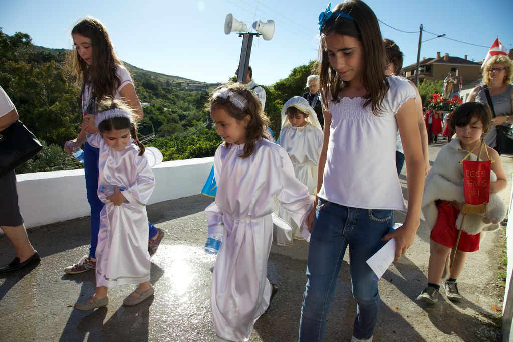Às seis começa a procissão. O meu sobrinho abre a procissão com mais dois jovens. Segue-se a banda, dois andores, e a população. Há também crianças mascaradas de pastores e anjinhos, com fatos de branco brilhante. A procissão desce em direcção a uma ponta da aldeia, ocupa a estrada nacional 248-3 (cuidadosamente cortada pelos militares da GNR), e volta a entrar na aldeia, subindo até à igreja.