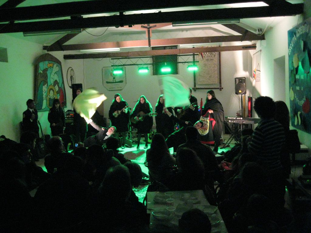 Quando chegámos, estava a PauliTuna a actuar, com a sede do Agrupamento 773 bastante cheia. Um terço do espaço estava ocupado com o palco, outro terço com mesas e o resto com pessoal em pé.