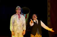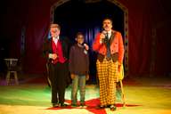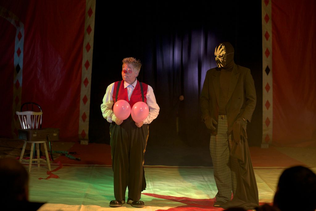 - Um homem máscara mais a palhaça simulam um número de magia com um espectador (Edy, Aida, espectador).