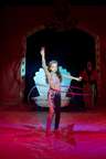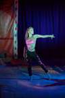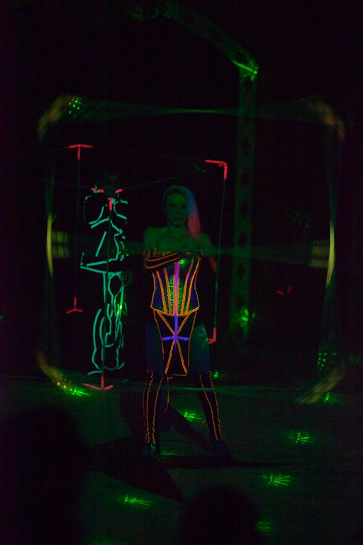 - Na escuridão, luz negra mais um LASER reagem com roupas fluorescentes para realçar um número de manipulação de cubos e bastões florescentes (Diana, Edy, Jessica).