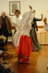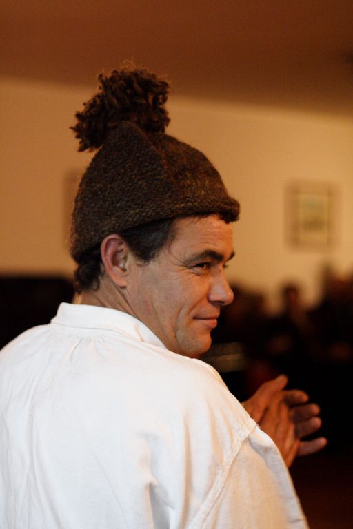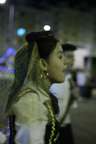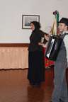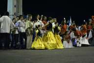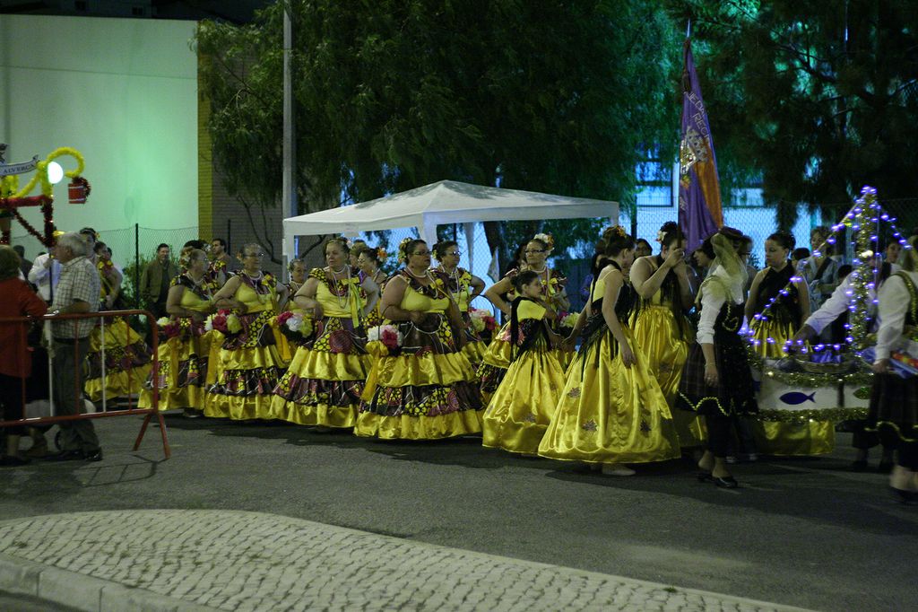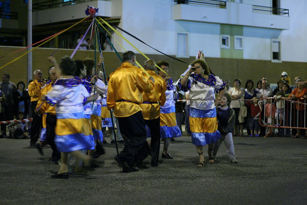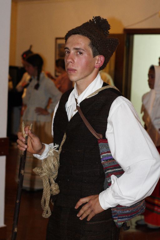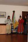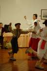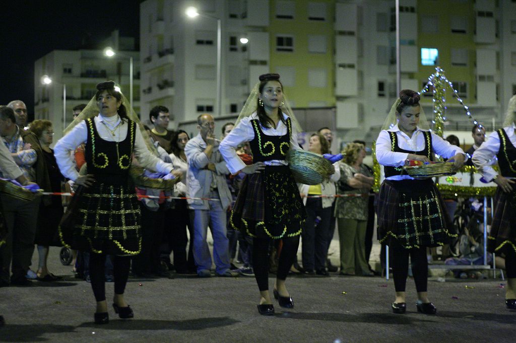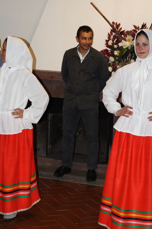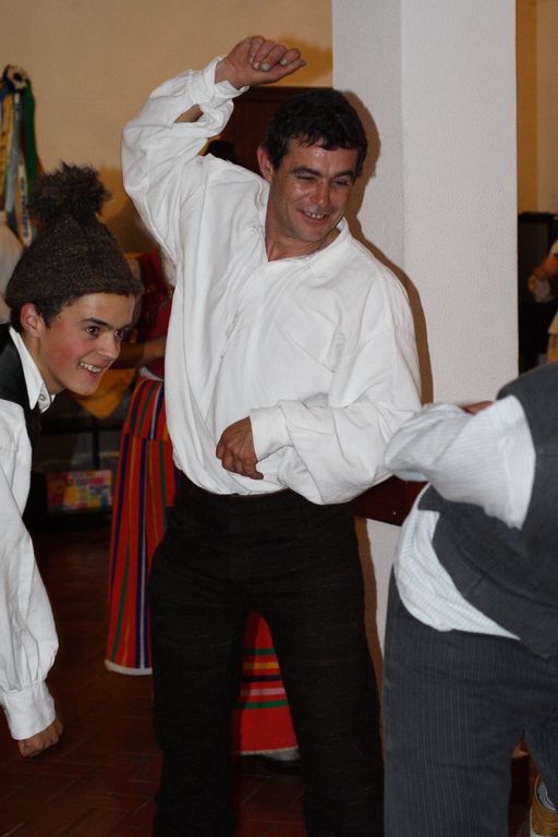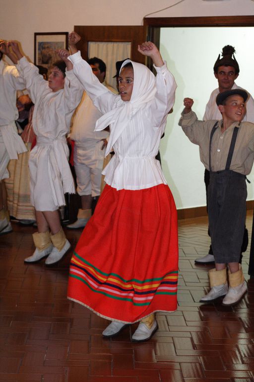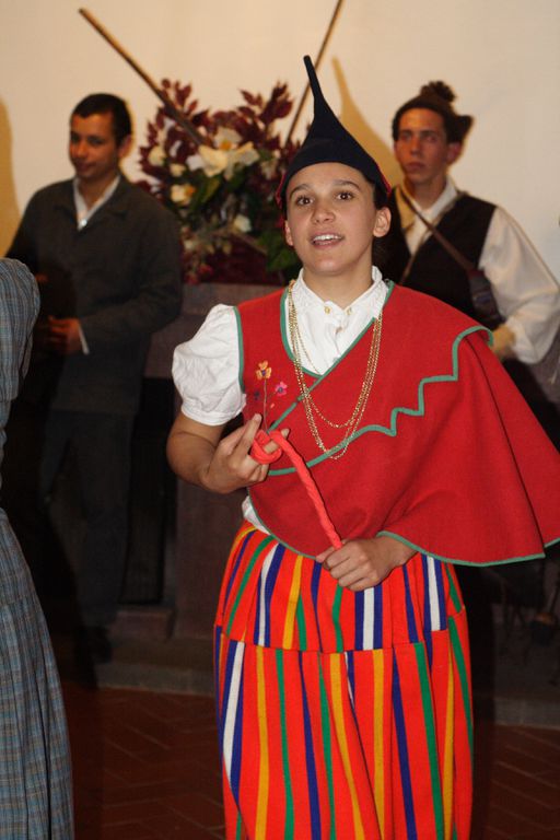 Rancho folclórico da casa do povo de Curral das Freiras actua no Inatel de Santo da Serra, na Madeira, numa sala apertada e com colunas no meio.