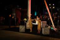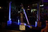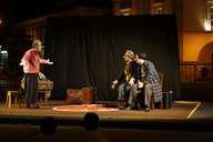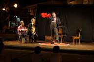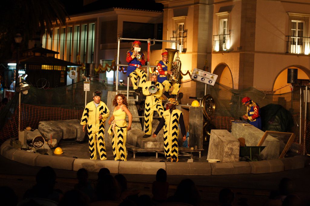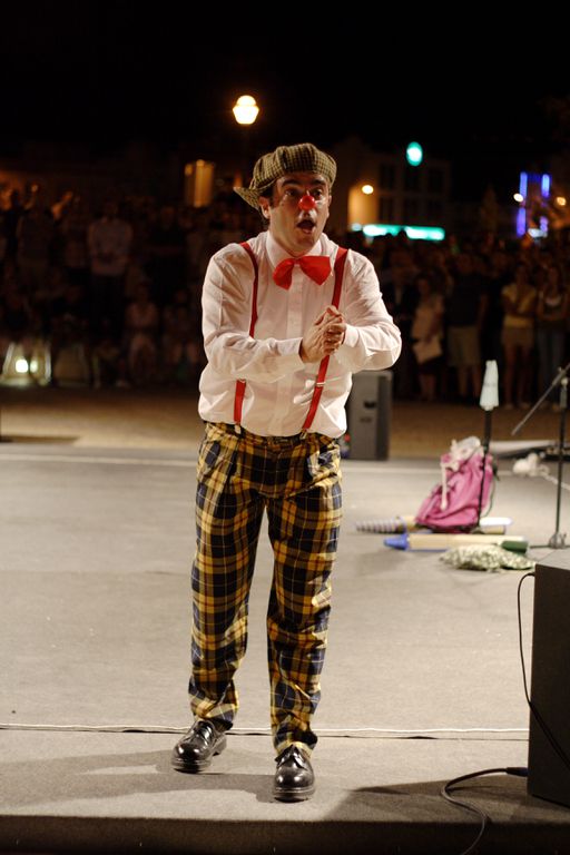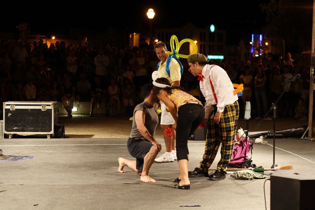 Genuíno espectáculo de rua, criando expectativa no público que se vai reunindo, depois criando situações cómicas com pouquíssimos materiais e, finalmente, envolvendo a participação de três espectadores.