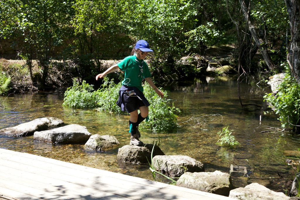 Segui os peregrinos até ao rio, pensando que teria fotos curiosas de montes de pessoal a saltar as pedras que permitem atravessar o rio. Batota! Tinham construído uma ponte temporária ao lado das pedras. Mesmo assim, pelo menos um adulto e uma criança não resistiram ao apelo das pedras.