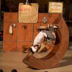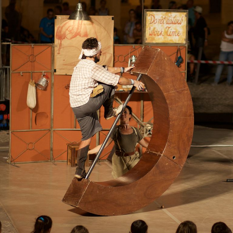 Quatro arcos de circunferência são montados de várias formas, criando o contexto para diferentes interacções entre os quatro artistas, incluindo uma bailarina e um trapezista. No fim, usam a roda final para quebrar nozes, para grande espanto da audiência e das crianças.