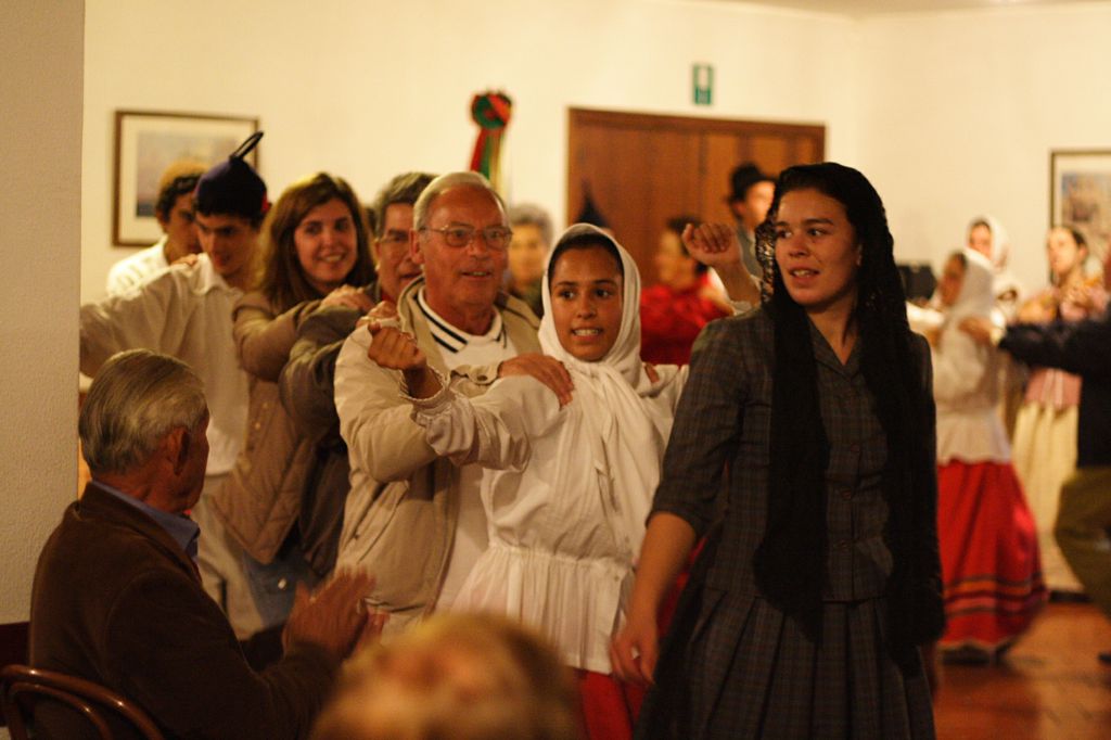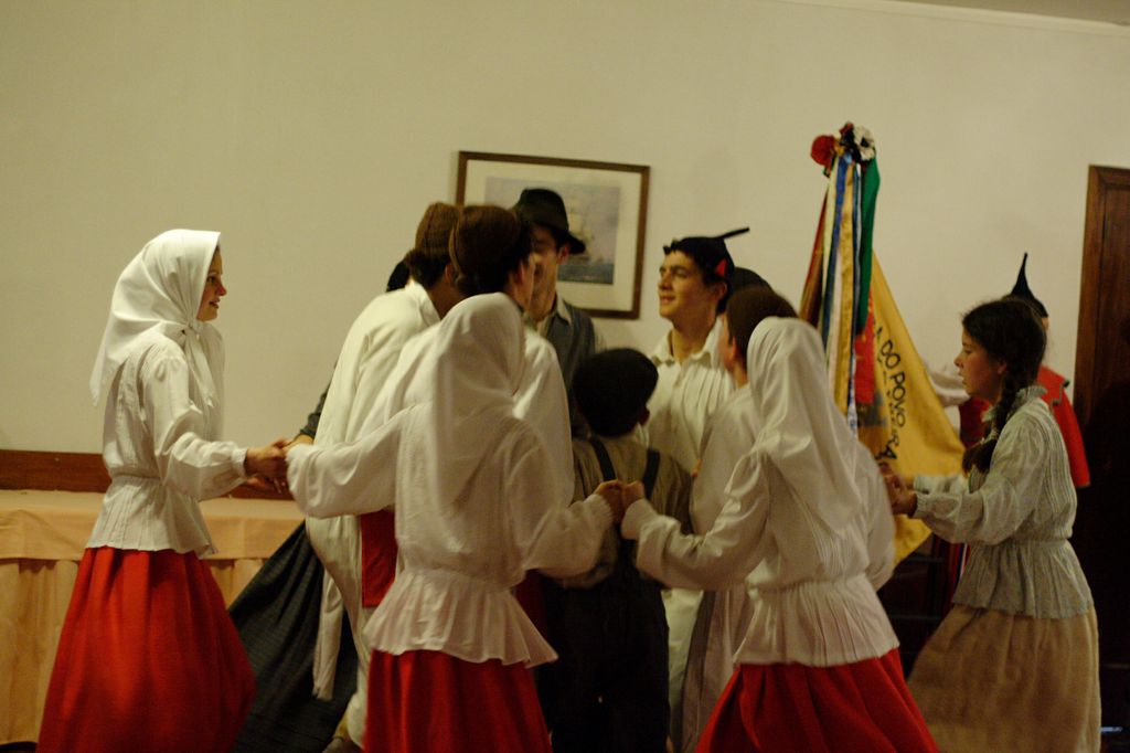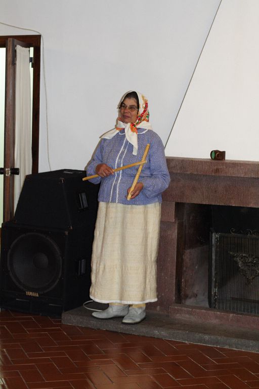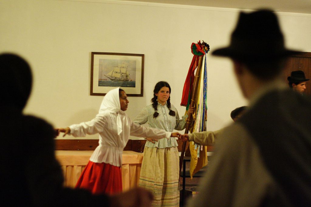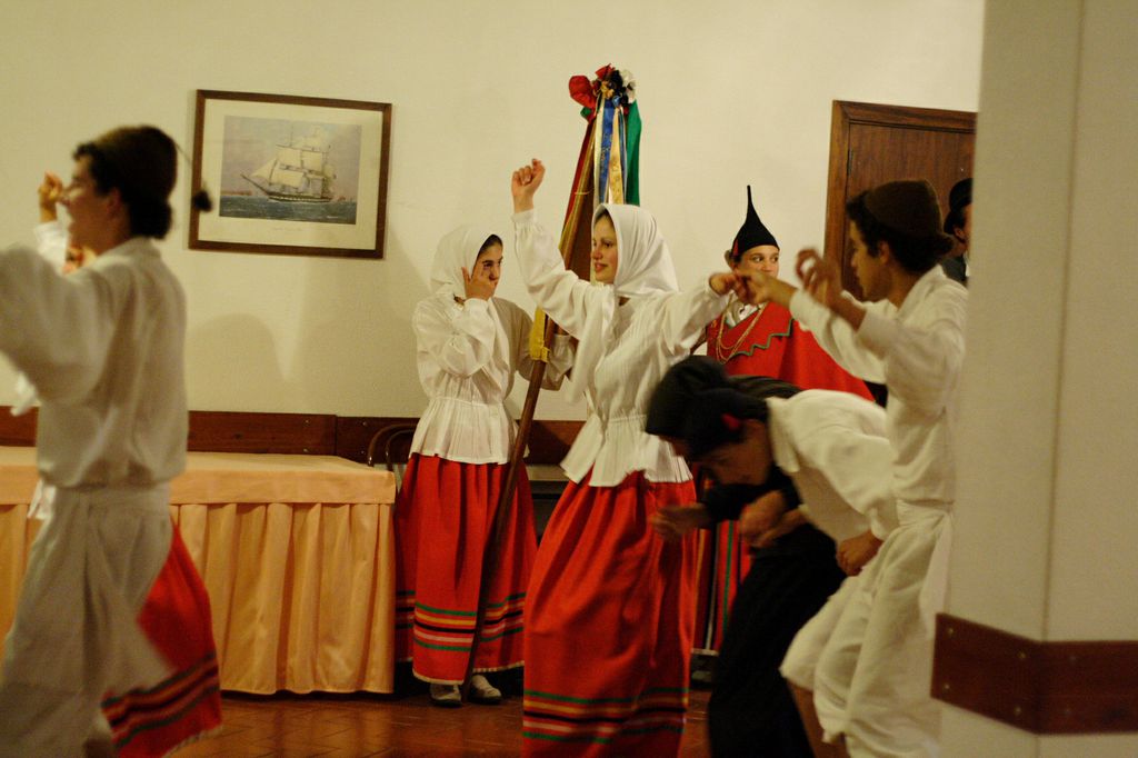 Rancho folclórico da casa do povo de Curral das Freiras actua no Inatel de Santo da Serra, na Madeira, numa sala apertada e com colunas no meio.