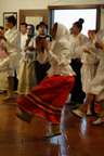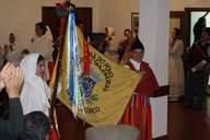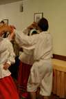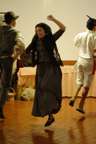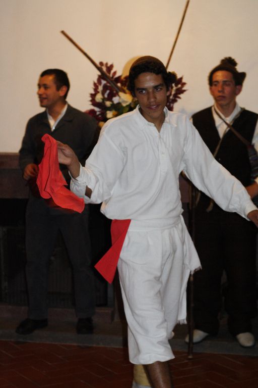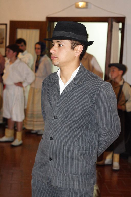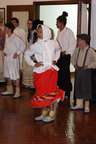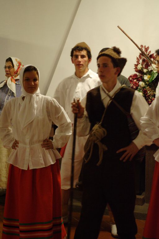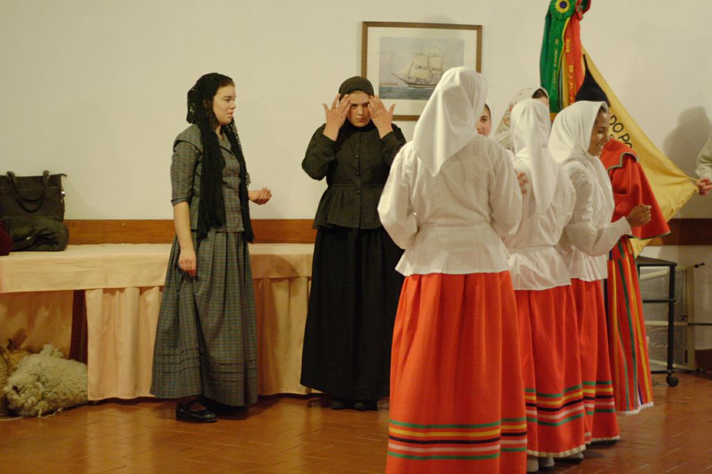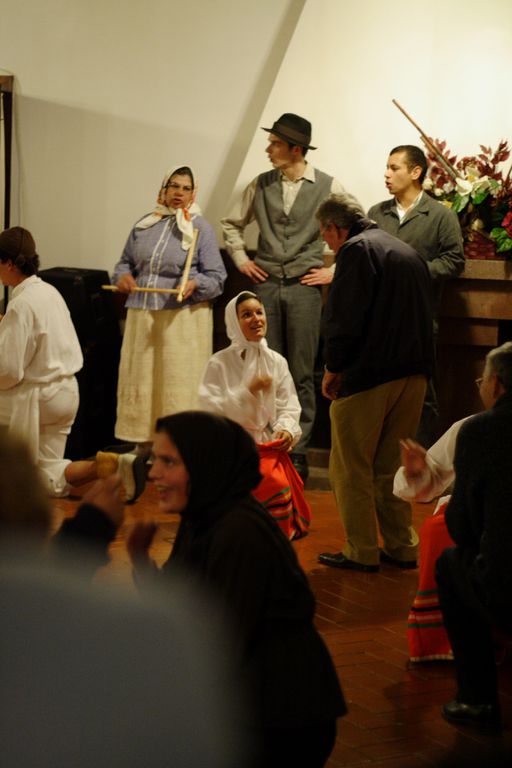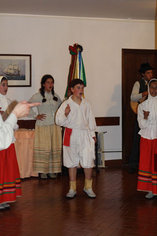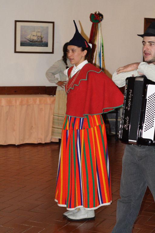 Rancho folclórico da casa do povo de Curral das Freiras actua no Inatel de Santo da Serra, na Madeira, numa sala apertada e com colunas no meio.
