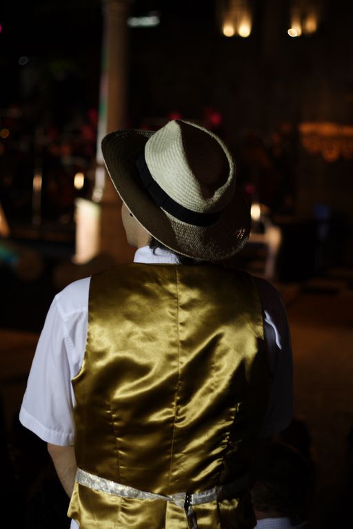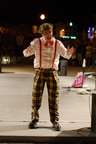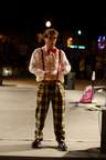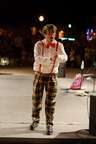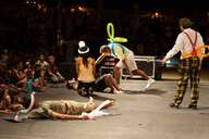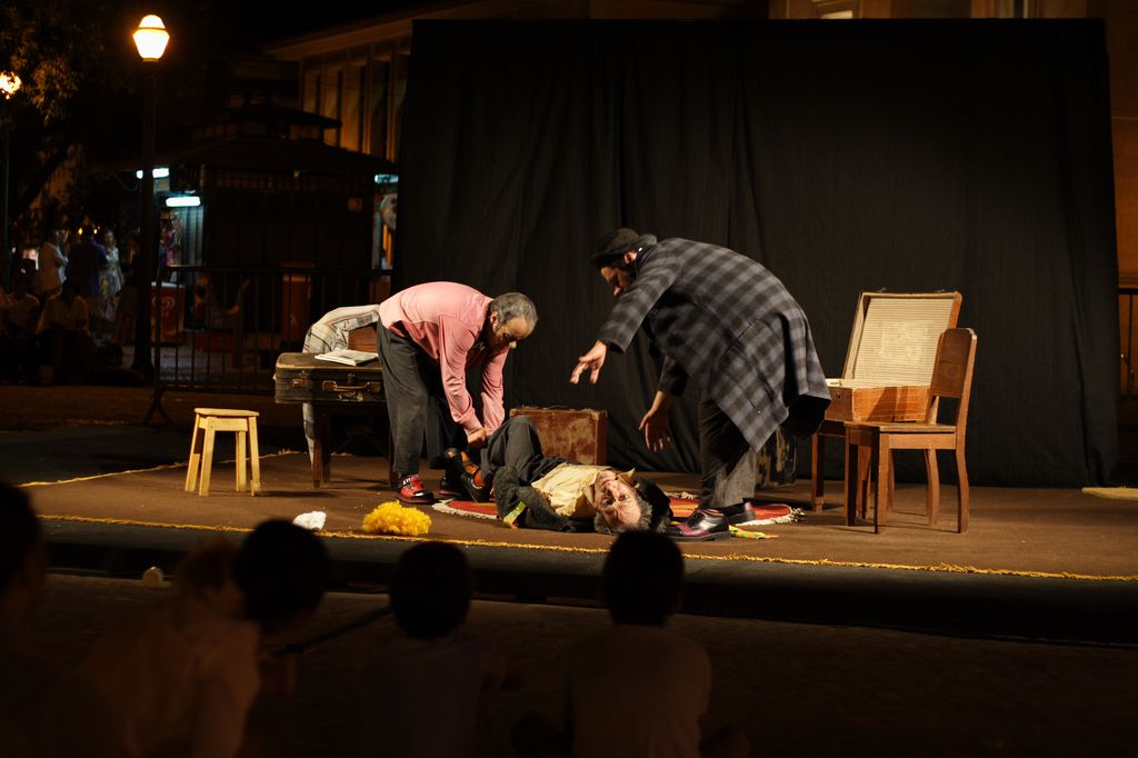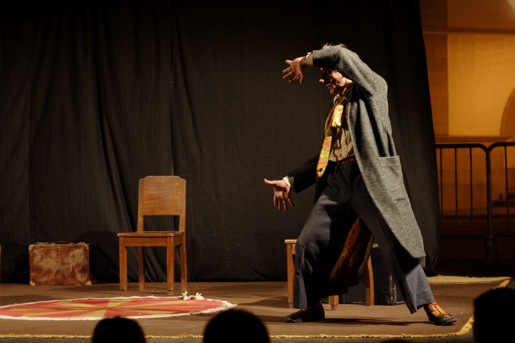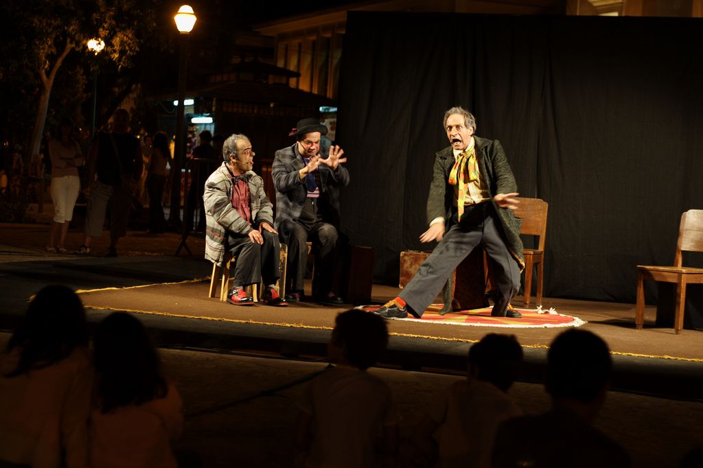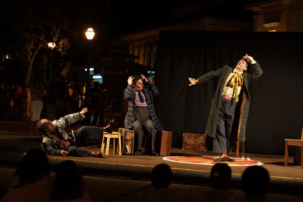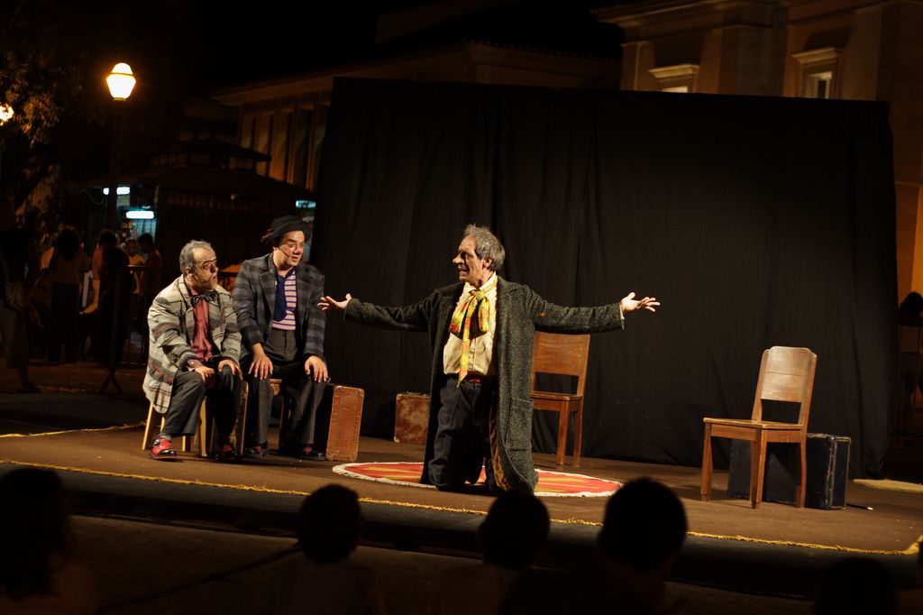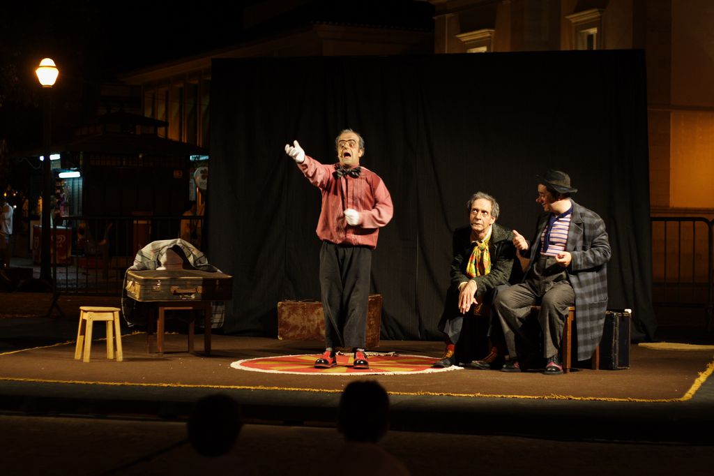 Genuíno espectáculo de rua, criando expectativa no público que se vai reunindo, depois criando situações cómicas com pouquíssimos materiais e, finalmente, envolvendo a participação de três espectadores.