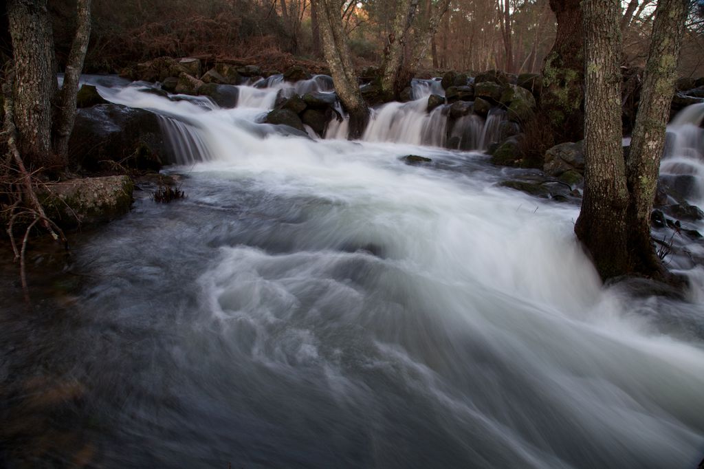 Estamos no Inverno e tem chovido, por isso o rio tem muito mais água que o habitual no Verão. Em cada açude, a água alterna entre a acalmia a montante e a violência a jusante. Como a Câmara andou a cortar as árvores e as silvas, o rio vê-se muito melhor, e as margens estão muito mais acessíveis.