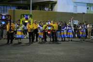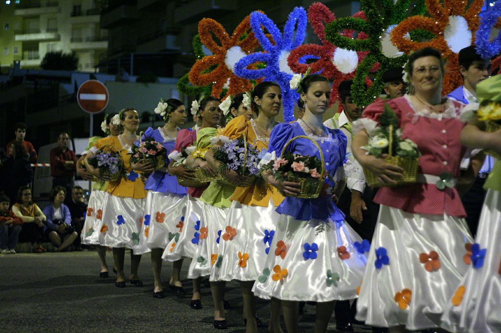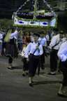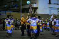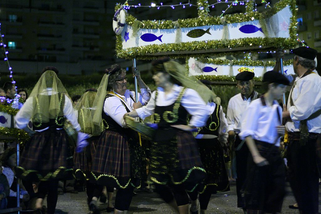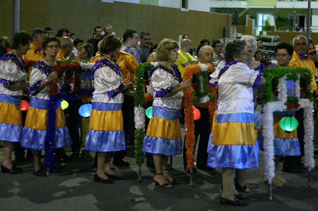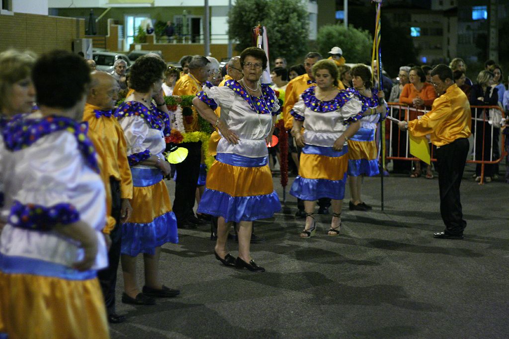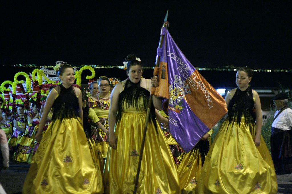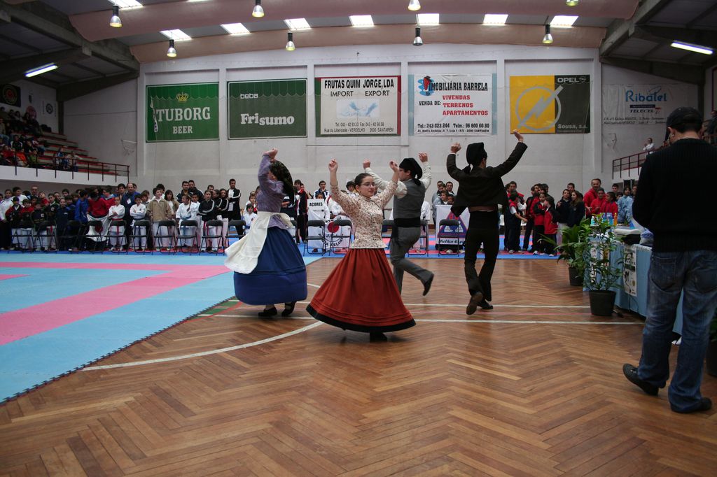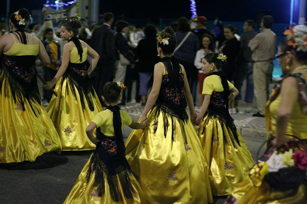 Rancho folclórico da casa do povo de Curral das Freiras actua no Inatel de Santo da Serra, na Madeira, numa sala apertada e com colunas no meio.